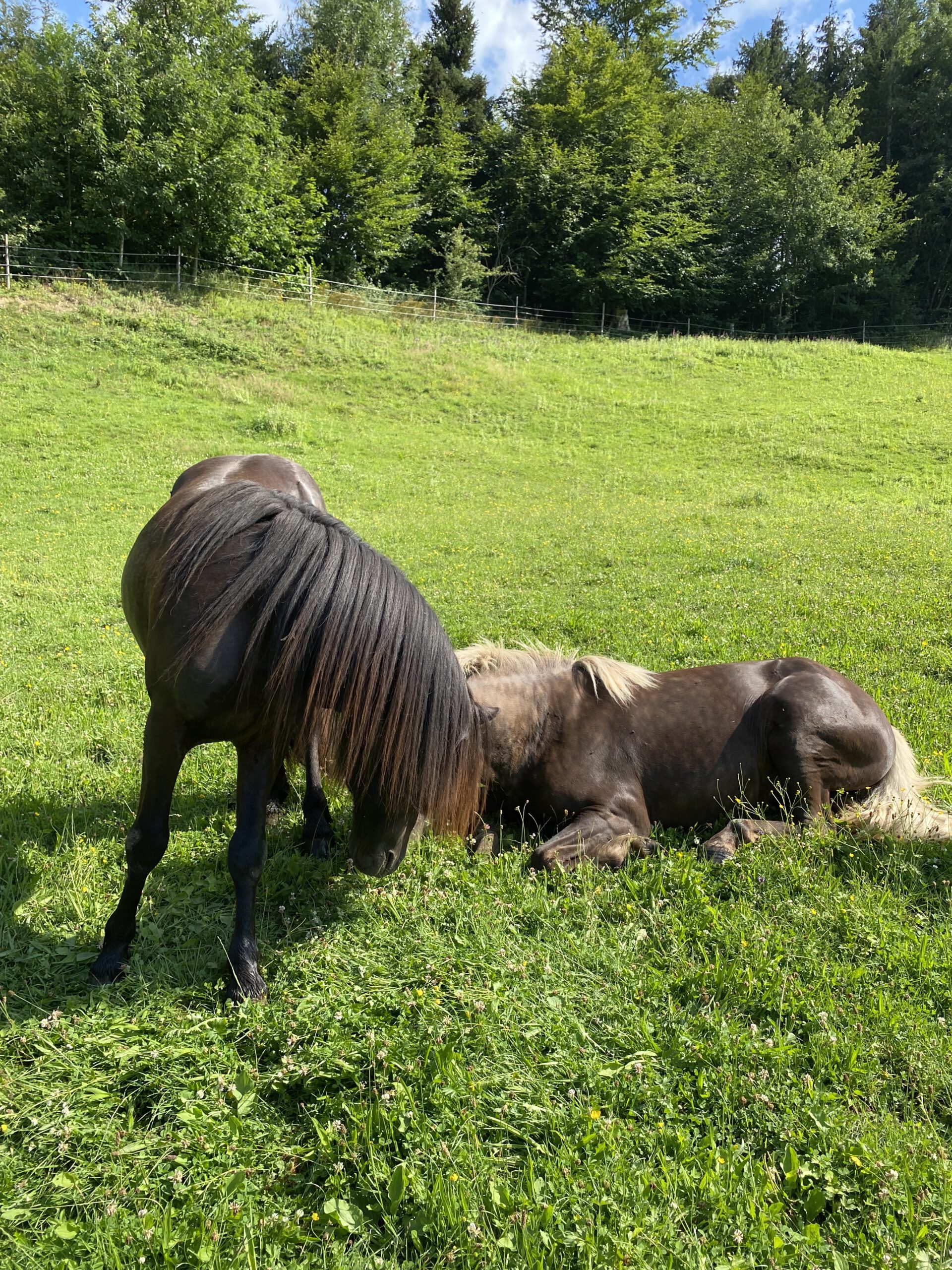 Erst haben wir zwei Stutfohlen in Sonderfarbe geschenkt bekommen: Rappwindfarbene Eylin, Tochter unserer Storka vom Sommerberg und Rappfarbwechslerin Eyrun, Tochter unserer Völva fra Asgardi